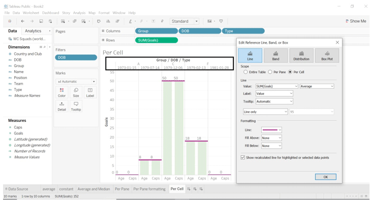 - When we select scope as per pane, tableau will calculate aggregation for each pane. For example, in the below example table, each group calculated the average for specified data for goals.