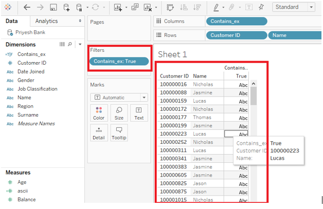 Use Case: You can put a dimension in place ‘Maharashtra’ and visualize the data. For example, if you have a dimension named “NAME” which contains the name of all customers of your bank and if you want to get the customer IDs of all employees whose name contains “as” in their name then you can use below query in your text editor. You also need to apply a filter so that you get customer IDs with the result as ‘True’.