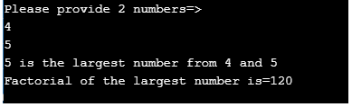 printf("Factorial of the largest number is=%d", factorial);//line11