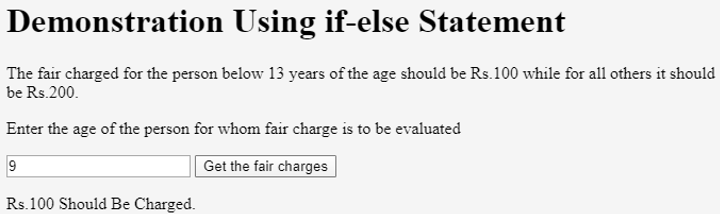 Consider one example where we want to cut the fair of the ticket, which is separate for children and adults. Children below the age of 13 should be charged Rs. 100 while all the adults and children above age 13 should be charged Rs. 200 for a particular occasion. Let us code for the same in javascript.