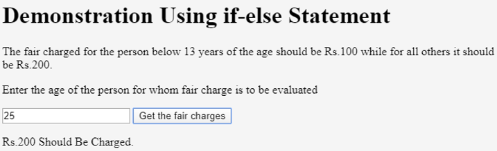 - The output of the above code when we enter age greater than or equal to 13 and click on the “Get the fair charges” button is as follows-