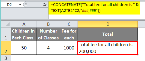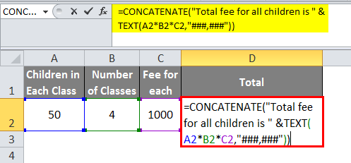 If we want the result in Total cell as “Total fee for all children is ###,###”, we can achieve this using a combination of text and concatenation function.