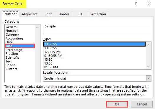 A dialog box of “Format Cells” will open. We need to select the Time option.