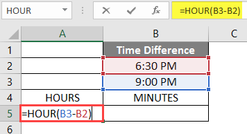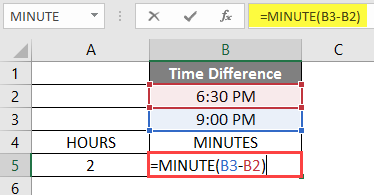 Write the formula as “= MINUTE (B3-B2)” to calculate the exact minutes irrespective of the hours and seconds.