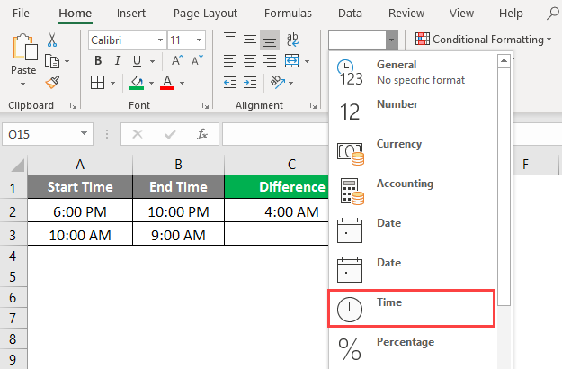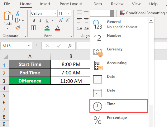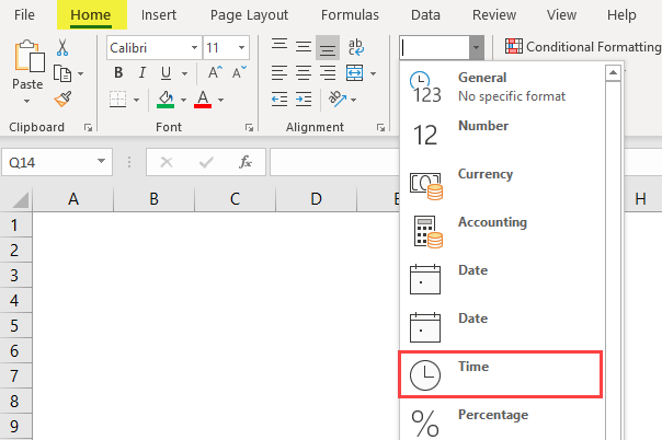 Go to the Home tab, and in Number Group, select Click on Time from the drop-down menu to change the cell value into a Time value.