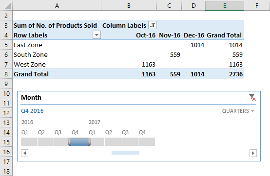 - Now with the help of this excel timeline, you can arrange the records in the Pivot table by adjusting and clicking. Refer to the below screenshot.