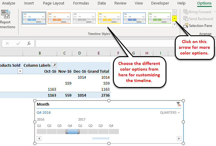 - An Excel timeline is useful for filtering the data in the Pivot table very quickly.