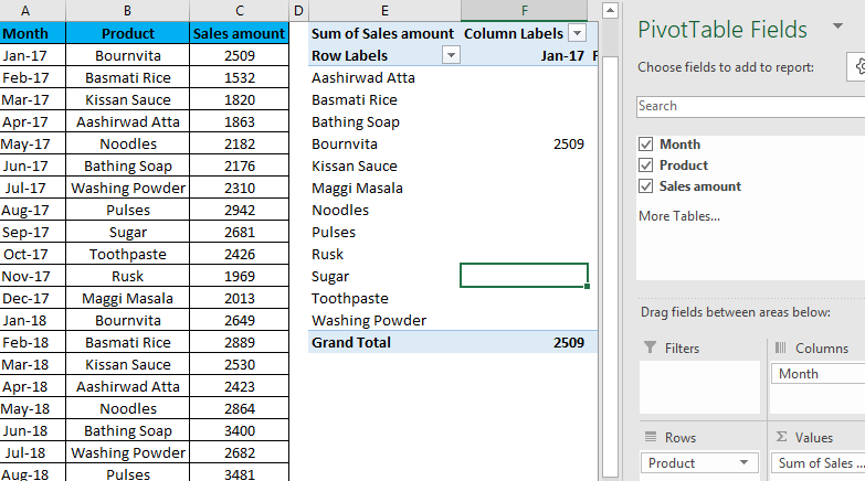 - Now we will create a table for the above data. Here, we are inserting the pivot table in the same sheet with the data set.