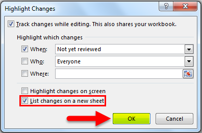 Step 2: Choose “list changes on a new sheet” from this option and click “OK”.