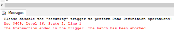 PRINT 'Please disable the "security" trigger to perform Data Definition operations!'