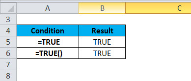 - If we want to get the result as TRUE, we directly use the TRUE formula, and Excel will return the logical value TRUE as output.