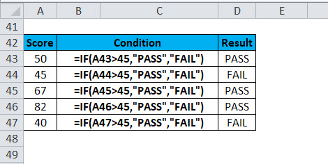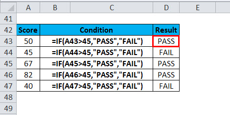 In the above example, If the condition is met and returns TRUE, then the expression will return the second argument as output, i.e. “PASS”.