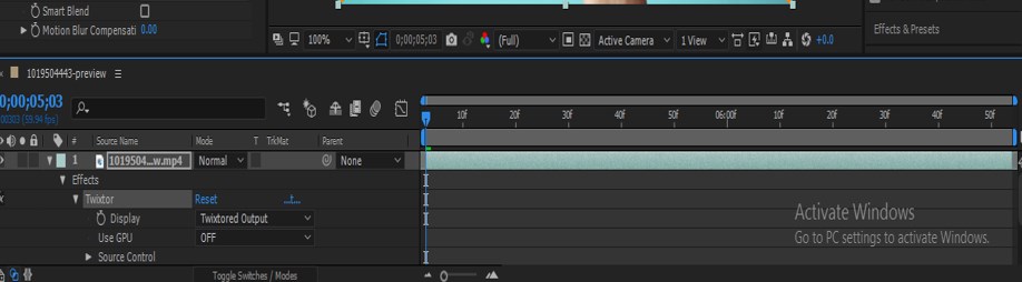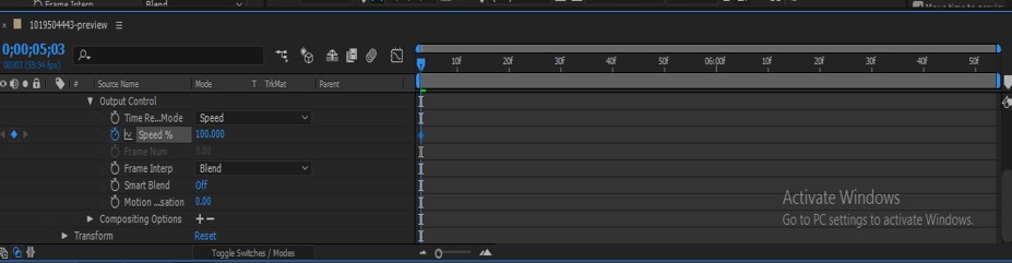 Step 10: Now, let us animate the Speed option of the Twixtor option of this layer; for animating this, click on the small clock icon of this speed property and place the keyframe play head at the starting of the timeline section.