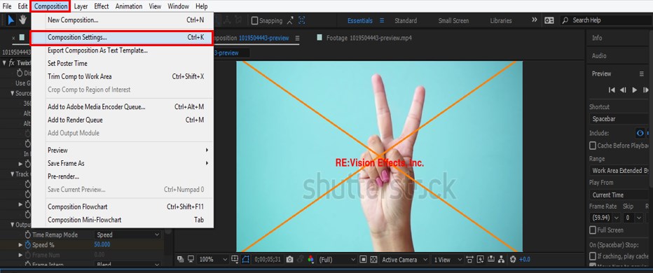 Step 13: Now increase the duration of video footage from composition settings. For composition, settings go to the Composition menu of the Menu bar, which is at the top of the working screen of this software on the top ribbon. Now click on Composition settings of a drop-down list, or you can simply press the Ctrl + K button from the keyboard as a short cut key for opening the Composition settings box.