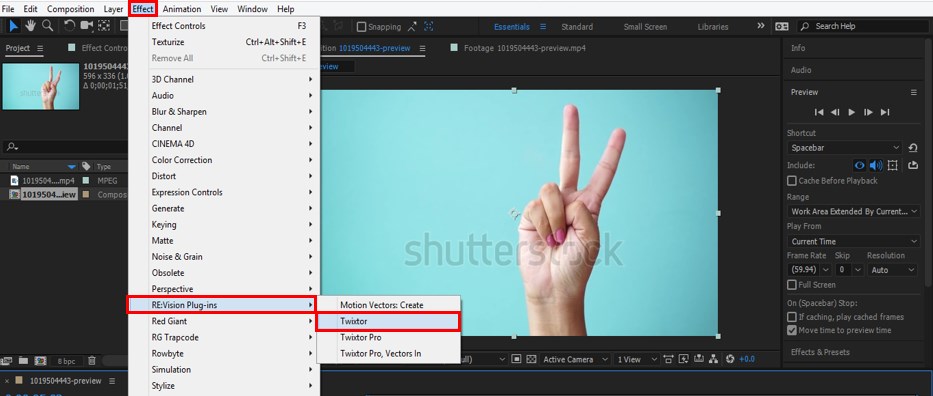 Step 5: Now go to Effect Menu of Menu bar at the top of the working screen. Then go to RE: Vision Plug-ins option of the drop-down list and then click on the Twixtor option of the new drop-down list. If you have not a Twixtor plugin on your computer, then you can download it from the internet.