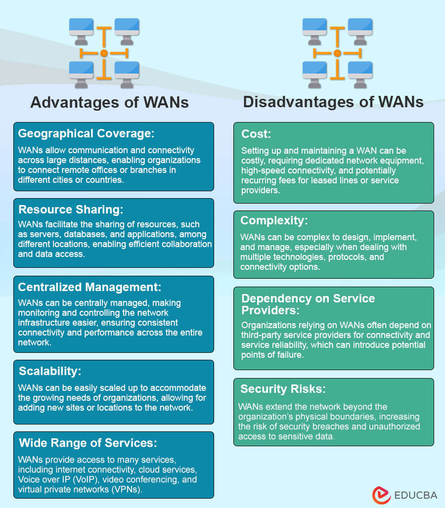 - Large Geographic Coverage: WANs cover a significant geographic area, ranging from regional, national, or international scopes.