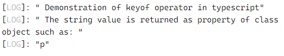 In the above program, we have declared a class named “A” and in it, we have “p” of number type and we have assigned a value of “9” then we have declared another variable “q” where we are making the “q” that holds the type of class using the keyword “keyof” and then we are assigning the “p” as a string value to “q” therefore when we print the value of “q” it prints the string value as “p” but not as “9” where we can see how keyof operator is used for printing the property of an object with its type value but not literal value and if we want to print the value then we need to use getclass_nameprop() method which use “this” operator to refer to the value. The output of the above code is as shown in the screenshot. We should note that we cannot use any other property name other than “p” in the code else it will throw an error saying the other property name will not be assignable to the type ‘ “p” ’.