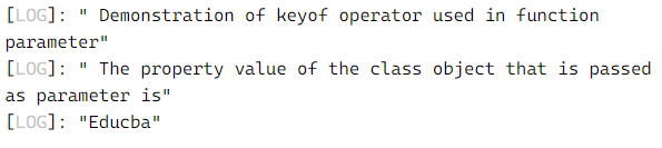 In the above program, we have declared a class named “function_keyof” in which “p” is a class object with type string we can also use type number in the newer version of typescript and the “p” is assigned with value “Educba”. Then we are using the getprop() function in which we are passing the parameter with keyof operator and returning the array of the values of the property. In the above code, we then call the function getprop() where we are passing “p” and the object of the class which will display only the value of that class object “p” and if we pass any other than “p” as expected it will throw an error..