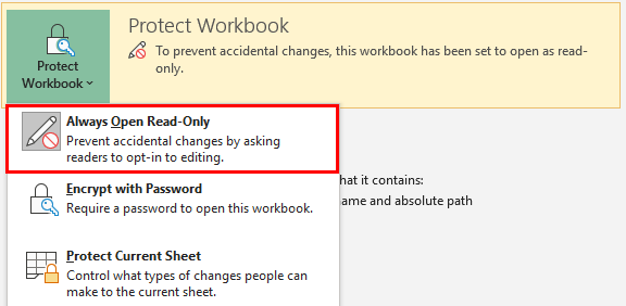 We can give only read-only access to the workbook for viewing the contents of the workbook. Then users can’t edit it. For the same, we can go to File > Info > Protect Workbook > Always open read-only, as shown below.