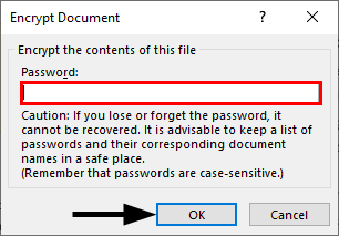 When a workbook is encrypted with a password, we have to go to File > Info > Protect Workbook > Encrypt with password; then, it will ask to enter the password in the dialogue box. As shown below, we’ll just have to clear the password and press the OK key.