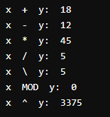 Console.WriteLine("x MOD y: {0}", x Mod y)