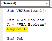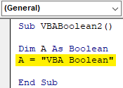 Step 3: Now assign a text to defined variable A. Let’s say that text is VBA Boolean. And it should be under inverted commas.
