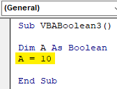Sub VBABoolean3() Dim A As Boolean A = 10 End Sub