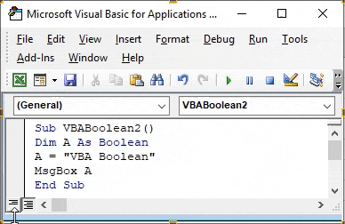 Sub VBABoolean2() Dim A As Boolean A = "VBA Boolean" End Sub