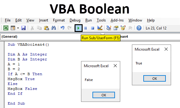 Sub VBABoolean4() Dim A As Integer Dim B As Integer A = 1 B = 2 If A <= B Then MsgBox True Else MsgBox False End If End Sub