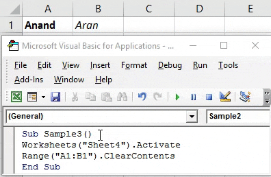 Sub Sample3() Worksheets("Sheet4").Activate Range("A1:B1").ClearContents End Sub