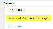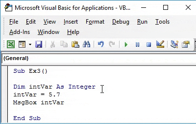 Sub Ex3() Dim intVar As Integer intVar = 5.7 End Sub
