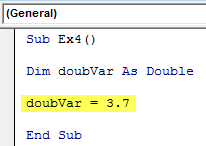 Sub Ex4() Dim doubVar As Double doubVar = 3.7 End Sub
