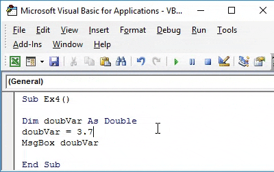 Sub Ex4() Dim doubVar As Double doubVar = 3.7 MsgBox doubVar End Sub