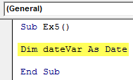 Sub Ex5() Dim dateVar As Date dateVar = Now() End Sub