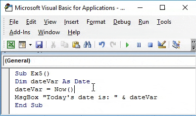 Sub Ex5() Dim dateVar As Date dateVar = Now() MsgBox "Today's date is: " & dateVar End Sub
