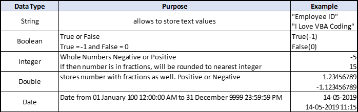 There are roughly more than 15 data types present under VBA. However, this article will discuss the most commonly used data types (almost surely used more than 90% of the time).