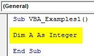 Sub VBA_Examples1() Dim A As Integer End Sub