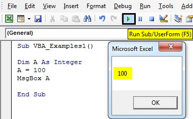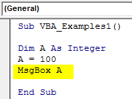 Sub VBA_Examples1() Dim A As Integer A = 100 MsgBox A End Sub