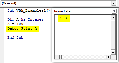 Sub VBA_Examples1() Dim A As Integer A = 100 Debug.Print A End Sub