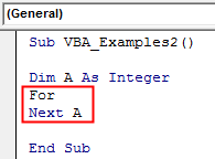 Sub VBA_Examples2() Dim A As Integer For Next A End Sub