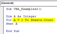 Sub VBA_Examples2() Dim A As Integer For A = 1 To Sheets.Count Next A End Sub