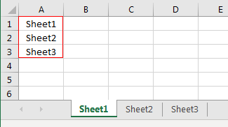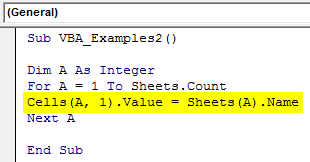 Sub VBA_Examples2() Dim A As Integer For A = 1 To Sheets.Count Cells(A, 1).Value = Sheets(A).Name Next A End Sub