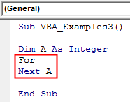Sub VBA_Examples3() Dim A As Integer For Next A End Sub