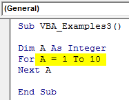 Sub VBA_Examples3() Dim A As Integer For A = 1 To 10 Next A End Sub