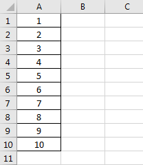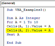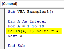 Sub VBA_Examples3() Dim A As Integer For A = 1 To 10 Cells(A, 1).Value = A Next A End Sub