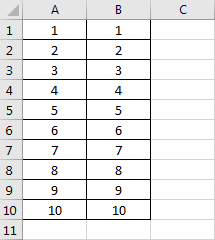 Sub VBA_Examples3() Dim A As Integer For A = 1 To 10 Cells(A, 1).Value = A Cells(A, 2).Value = A Next A End Sub