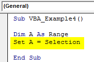 Sub VBA_Example4() Dim A As Range Set A = Selection End Sub
