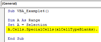 Sub VBA_Example4() Dim A As Range Set A = Selection A.Cells.SpecialCells(xlCellTypeBlanks). End Sub