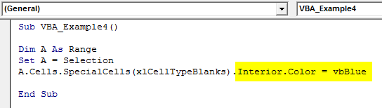 Sub VBA_Example4() Dim A As Range Set A = Selection A.Cells.SpecialCells(xlCellTypeBlanks).Interior.Color = vbBlue End Sub