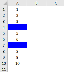 Step 6: Now select the range of cells and then run the code by pressing the F8 key or by clicking on the Play button. We will see, the cell A4 and A7 which were blank, are now highlighted with Blue color as shown below.